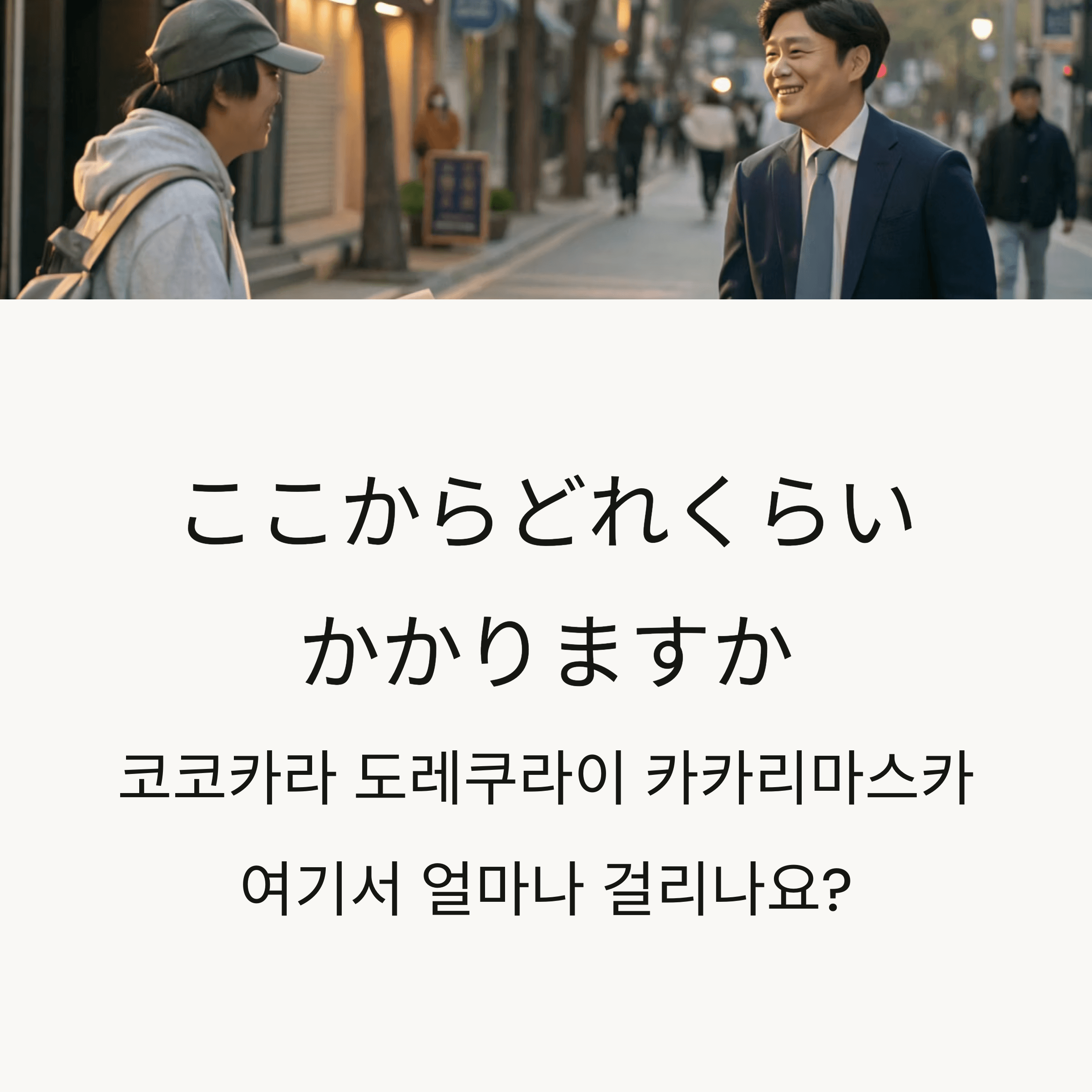오늘 배운 “ここからどれくらいかかりますか(코코카라 도레쿠라이 카카리마스카)”는 일본 여행 중 이동 시간이나 거리 정보를 정중하게 물을 때 매우 유용한 표현입니다. 목적지를 함께 말하면 더 정확하고, “すみません”을 앞에 붙이면 공손하고 자연스러운 인상을 줄 수 있어요. 도보, 전철, 택시 등 다양한 상황에서 활용해 보세요!