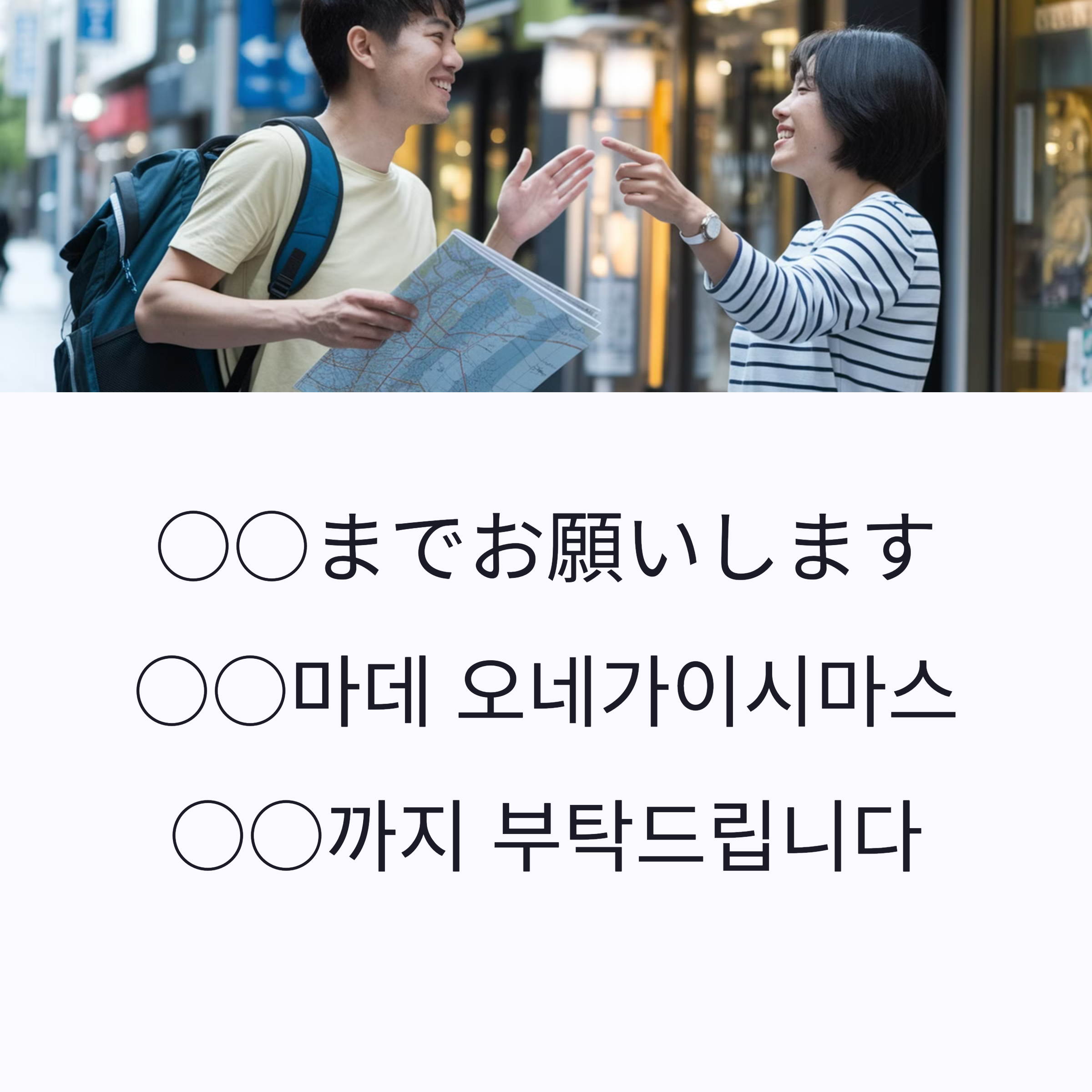 ‘○○までお願いします’는 일본에서 길을 물어보거나 이동을 요청할 때, 매우 자주 들을 수 있는 정중한 표현이에요. 예를 들어, “渋谷駅までお願いします”(시부야에키마데 오네가이시마스)라고 말하면 “시부야역까지 부탁드립니다”라는 의미가 되죠.