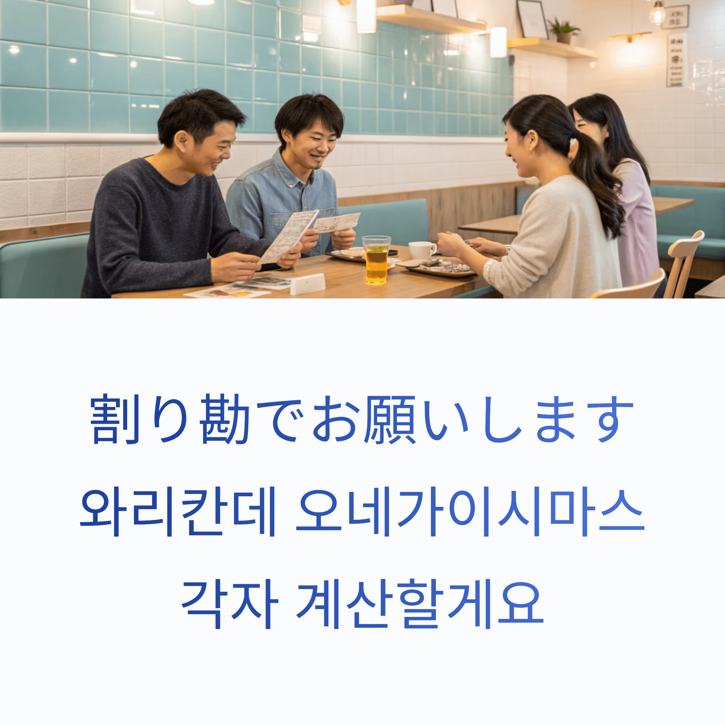 👉 “割り勘で” (와리칸데) 만 말해도 의미가 통하지만, “お願いします” (오네가이시마스)를 붙이면 훨씬 정중해져요