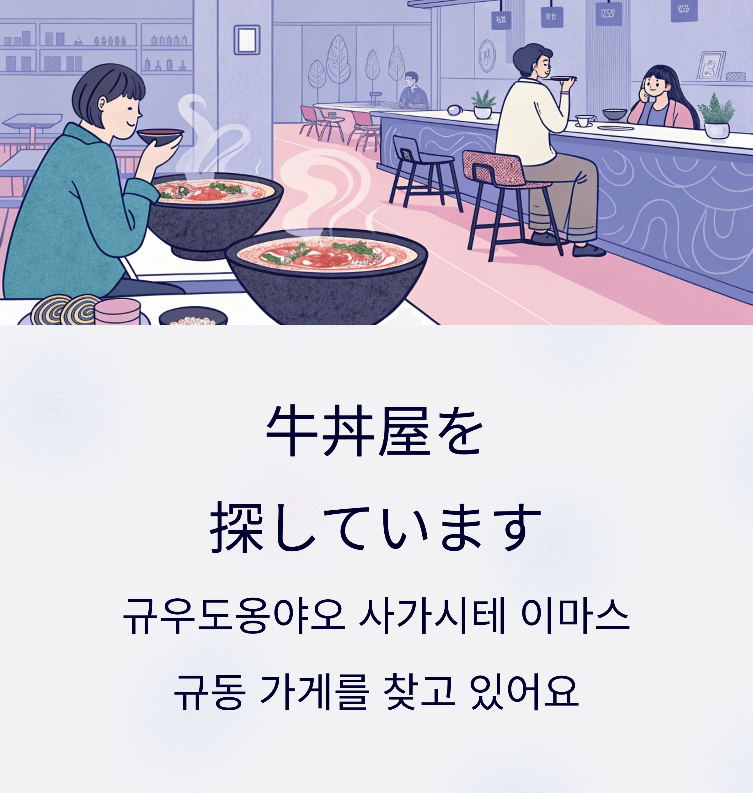 | 牛丼屋を探しています | 규동집을 찾고 있어요 | 규우도옹야오 사가시테 이마스 |