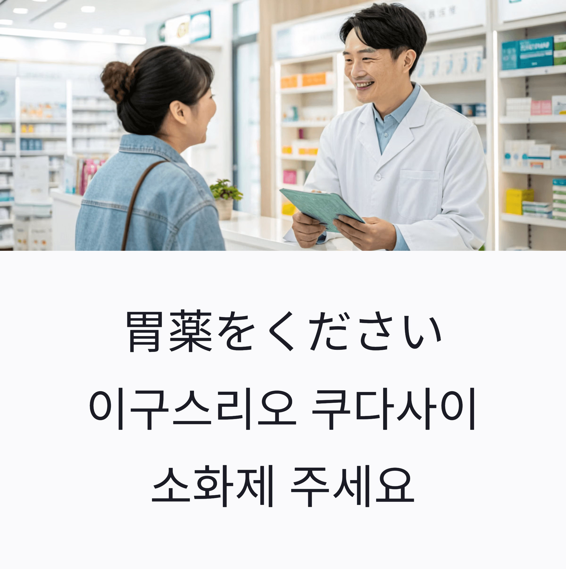 “胃薬をください(이구스리오 쿠다사이)”는 일본에서 소화 불량이나 속 쓰림 등 위장 증상이 있을 때 간단하고 예의 바르게 소화제를 요청할 수 있는 기본 표현입니다. 편의점에서도 의약외품으로 판매되는 소화제가 있기 때문에 이 표현을 알고 있으면 급할 때 유용하게 사용할 수 있어요.