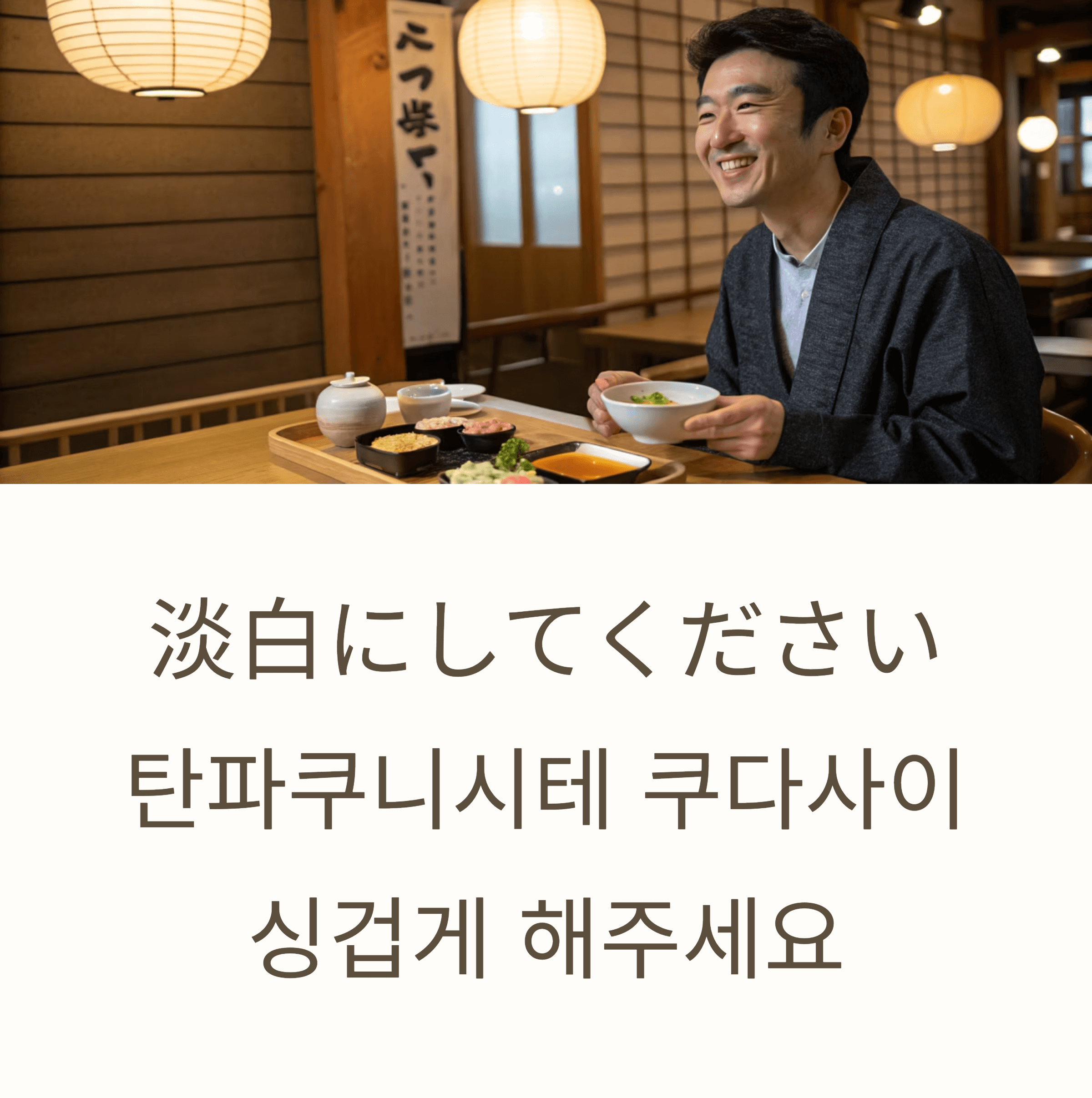 일본에서 건강하고 담백한 식사를 원한다면, “淡白にしてください。(탄파쿠니시테 쿠다사이)”라는 표현을 꼭 기억해보세요. 식당에서의 간단한 요청 하나로 더 맛있고 만족스러운 식사를 경험할 수 있고, 일본인에게도 배려 있는 이미지로 다가갈 수 있어요. 여행의 즐거움은 식사에서 시작되니까요!