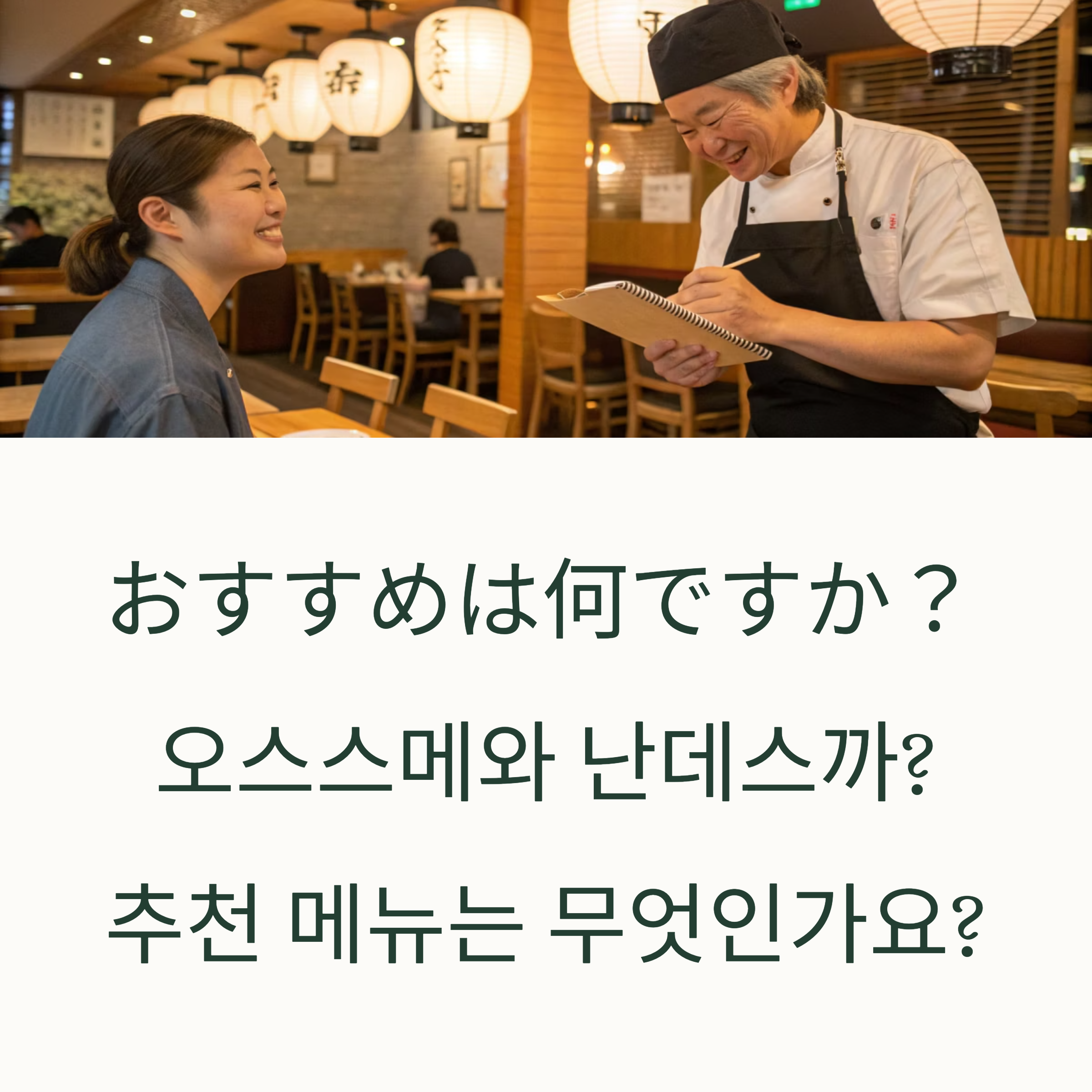 👉 ‘おすすめを教えていただけますか?(오스스메오 오시에떼 이타다케마스까?)’ = 추천해주실 수 있나요? 가 훨씬 공손한 표현이에요.