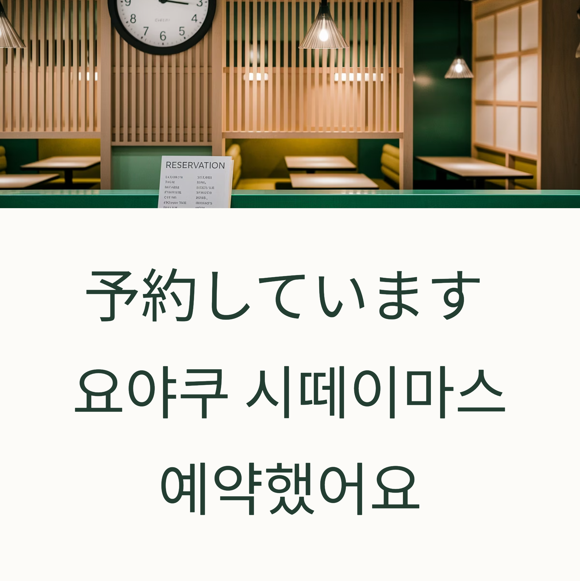 👉 예: ‘7時に予約しています(시치지니 요야쿠 시떼이마스)’ → 7시에 예약했어요.