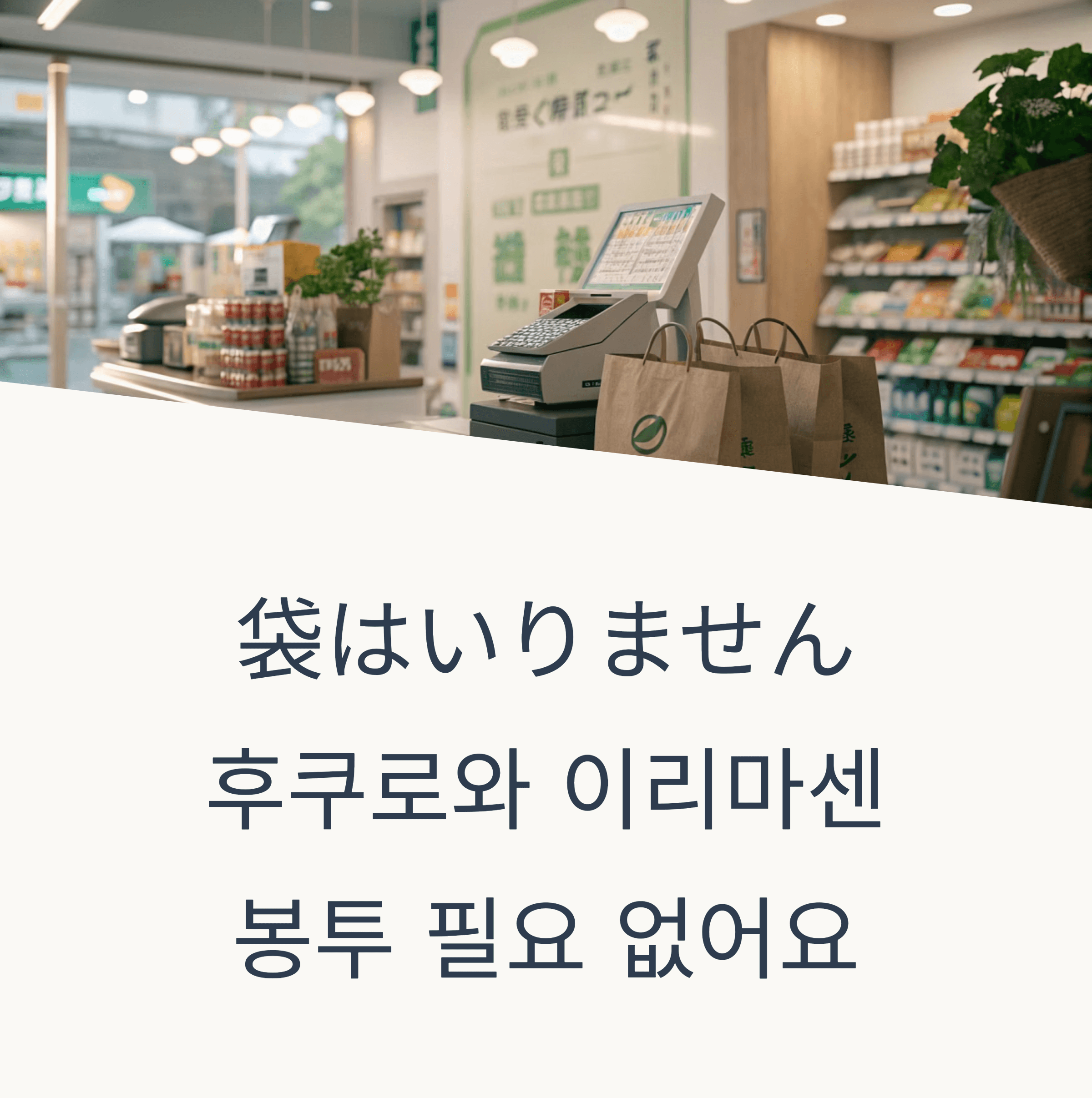 일본에서 쇼핑을 할 때, 계산대에서 “袋いりますか?”(봉투 필요하세요?)라는 질문을 자주 듣게 됩니다. 이럴 때 환경을 생각하는 마음으로 “袋はいりません。”이라고 답해보세요. 발음은 후쿠로와 이리마센이고, 의미는 “봉투 필요 없어요” 라는 뜻이에요. 간단하지만 매우 실용적인 표현으로, 일본에서의 쇼핑이 한층 더 스마트해질 거예요!
