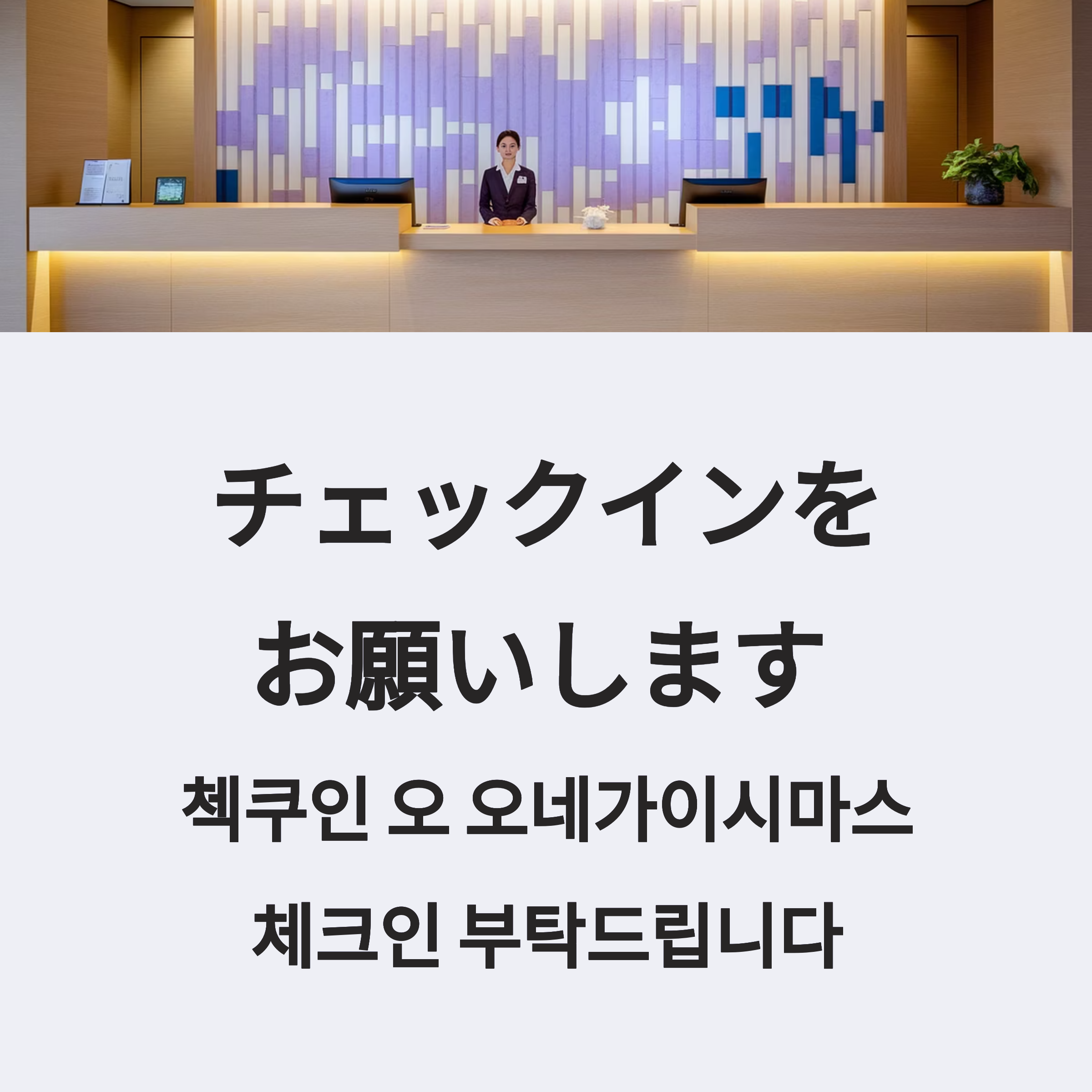 체크인은 일본어로도 ‘チェックイン(첵쿠인)’이라고 그대로 사용돼요. 여기에 ‘〜をお願いします(오 오네가이시마스)’를 붙이면 매우 정중한 요청이 됩니다. 여행 중 호텔에 도착했을 때, “체크인 부탁해요”라는 자연스럽고 공손한 표현으로 사용할 수 있어요. 일본 호텔에서는 예의 바른 인사가 특히 중요하니, 이 표현을 기억해두면 좋아요!
