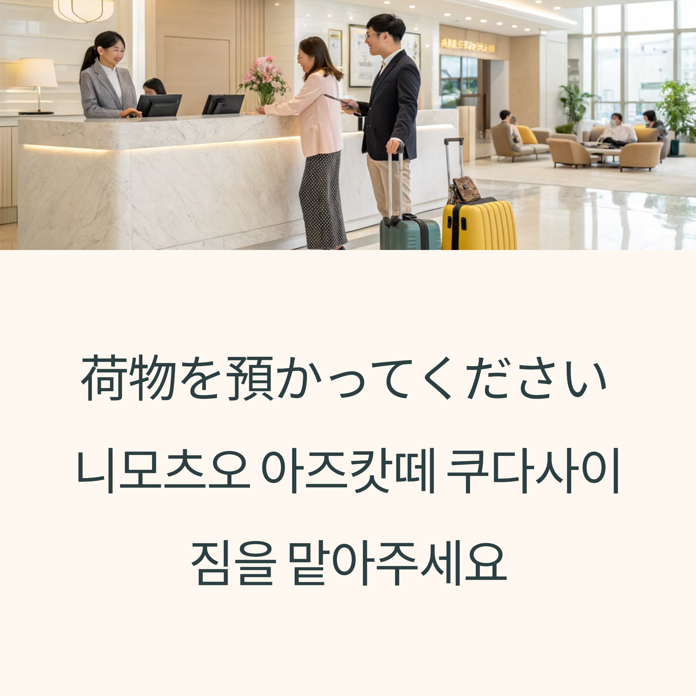일본 여행 중 호텔 체크인 전이나 체크아웃 후, 잠깐 짐을 맡기고 외출하고 싶을 때 꼭 필요한 표현이 바로 荷物を預かってください(니모츠오 아즈캇떼 쿠다사이)예요.“짐을 맡아주세요”라는 의미로, 프런트나 역의 서비스 센터에서 정중하게 사용할 수 있어요.
