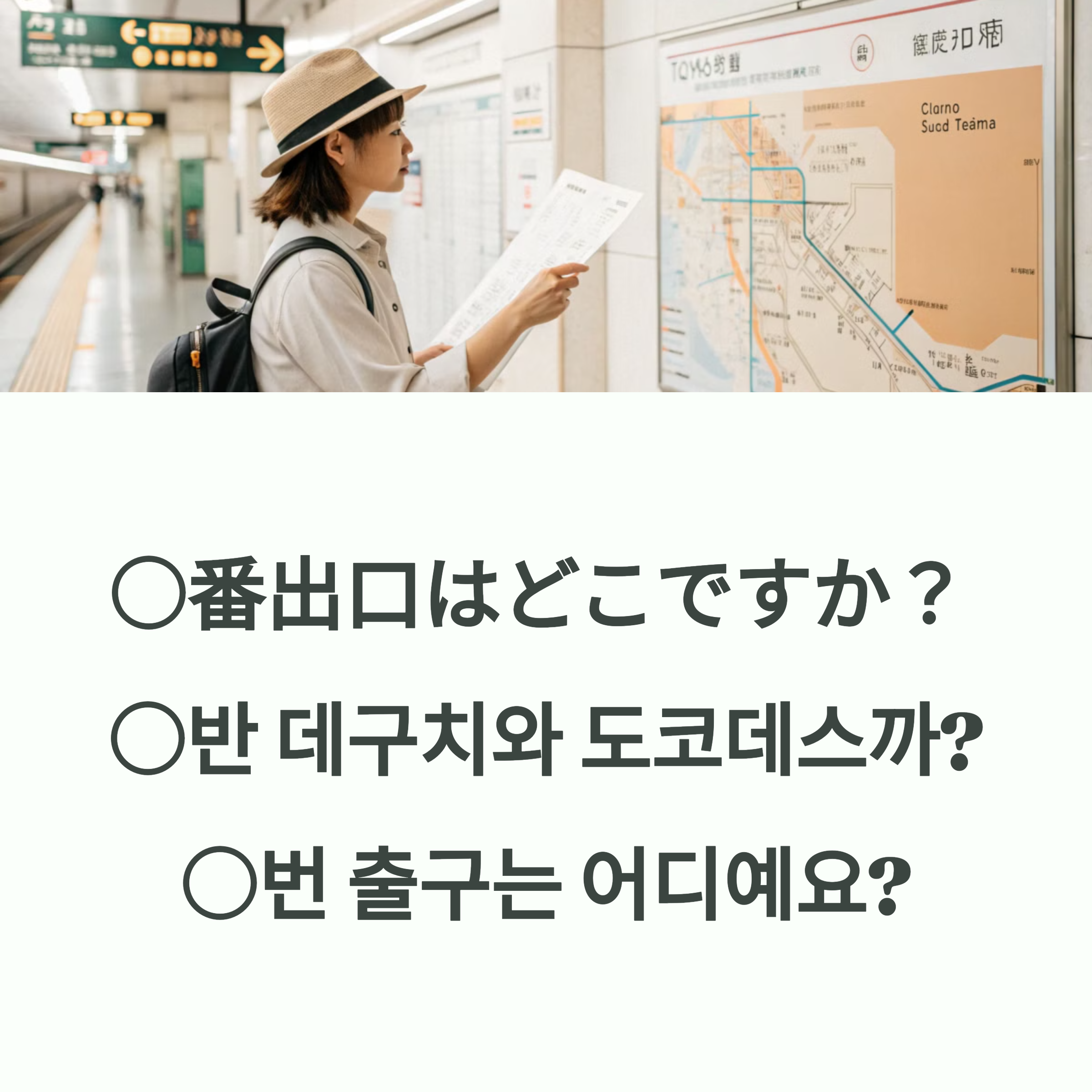 일본 도심 지하철역은 출구가 10개 이상인 곳도 많아서, 정확한 출구를 찾는 것이 아주 중요해요. 이럴 때 “○番出口はどこですか?”라고 물어보면 원하는 방향으로 빠르게 이동할 수 있어요. 간단하지만 현지인들도 많이 쓰는 실용적인 질문 표현이에요.