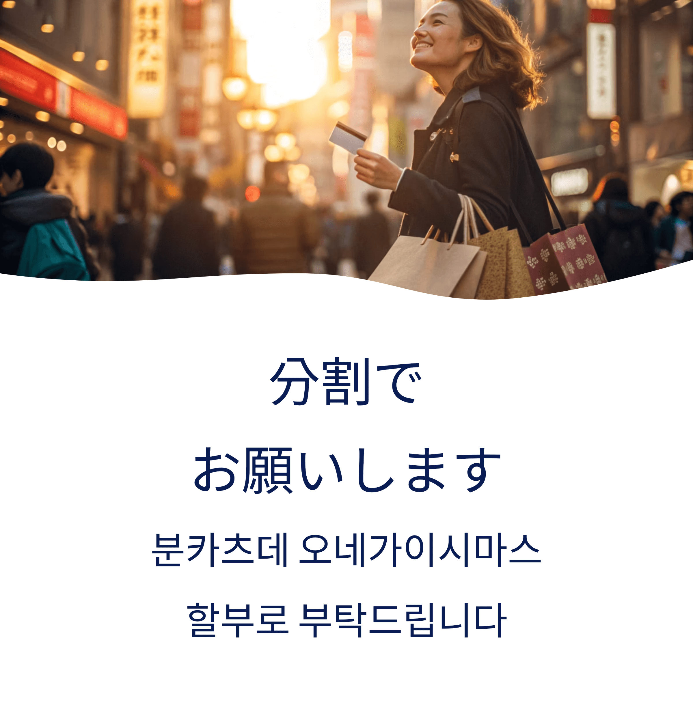分割(분카츠)는 ‘분할, 할부’를 의미하며, で는 ‘~로’, お願いします(오네가이시마스)는 ‘부탁드립니다’라는 뜻이에요. 쇼핑할 때 “○回でお願いします(몇 회 할부로 부탁드립니다)”라고 함께 말하면 더 정확하게 전달돼요.