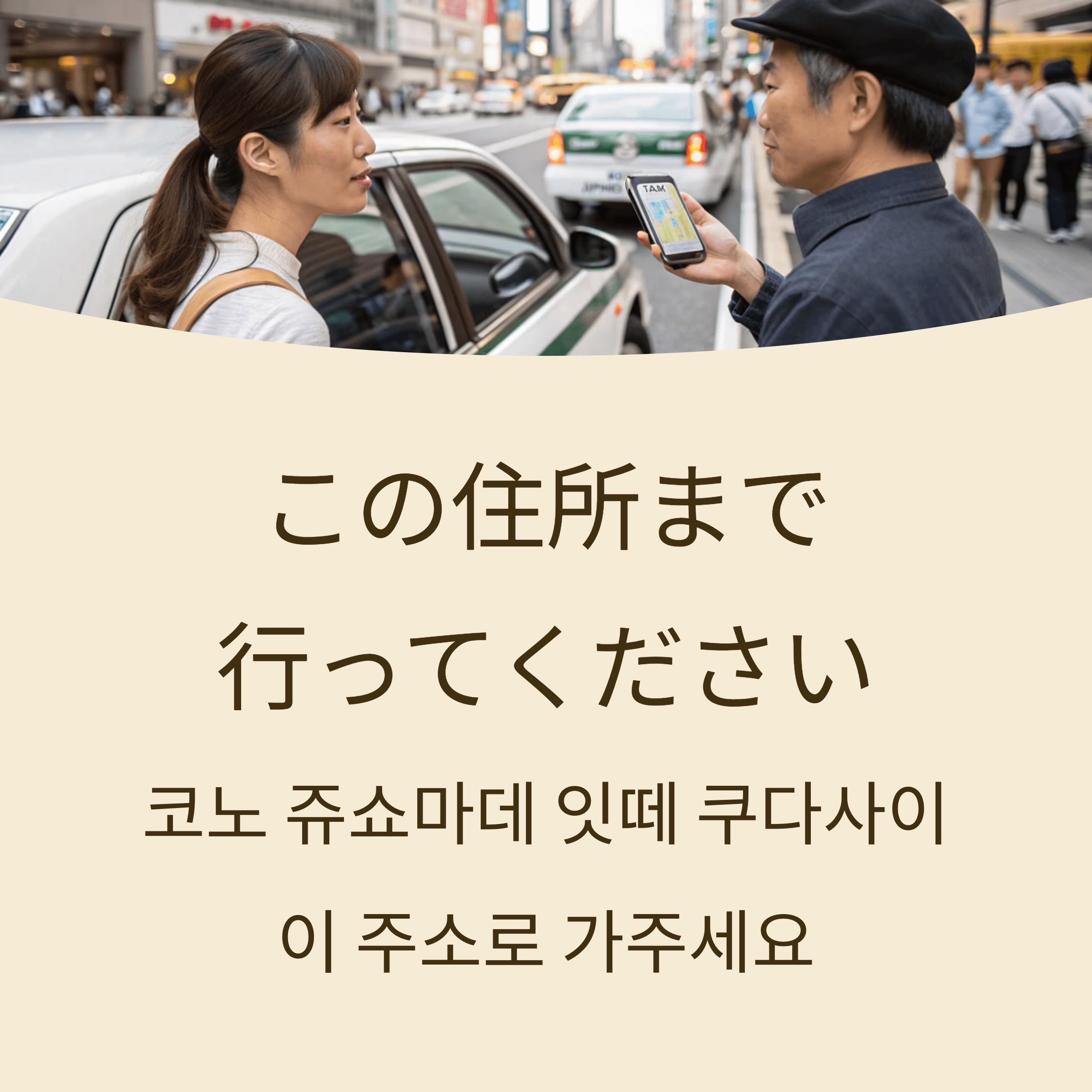 일본에서는 택시 기사나 주변 사람에게 길을 안내받을 때 丁寧語(정중한 표현)를 사용하는 것이 일반적이에요. “この住所まで行ってください”는 매우 공손하면서도 실용적인 표현으로, 실제 주소가 적힌 메모나 스마트폰 화면을 함께 보여주면 이해도를 높이고 커뮤니케이션도 부드러워져요. 관광지, 호텔, 음식점 어디든 쉽게 사용할 수 있는 실속 표현이에요.