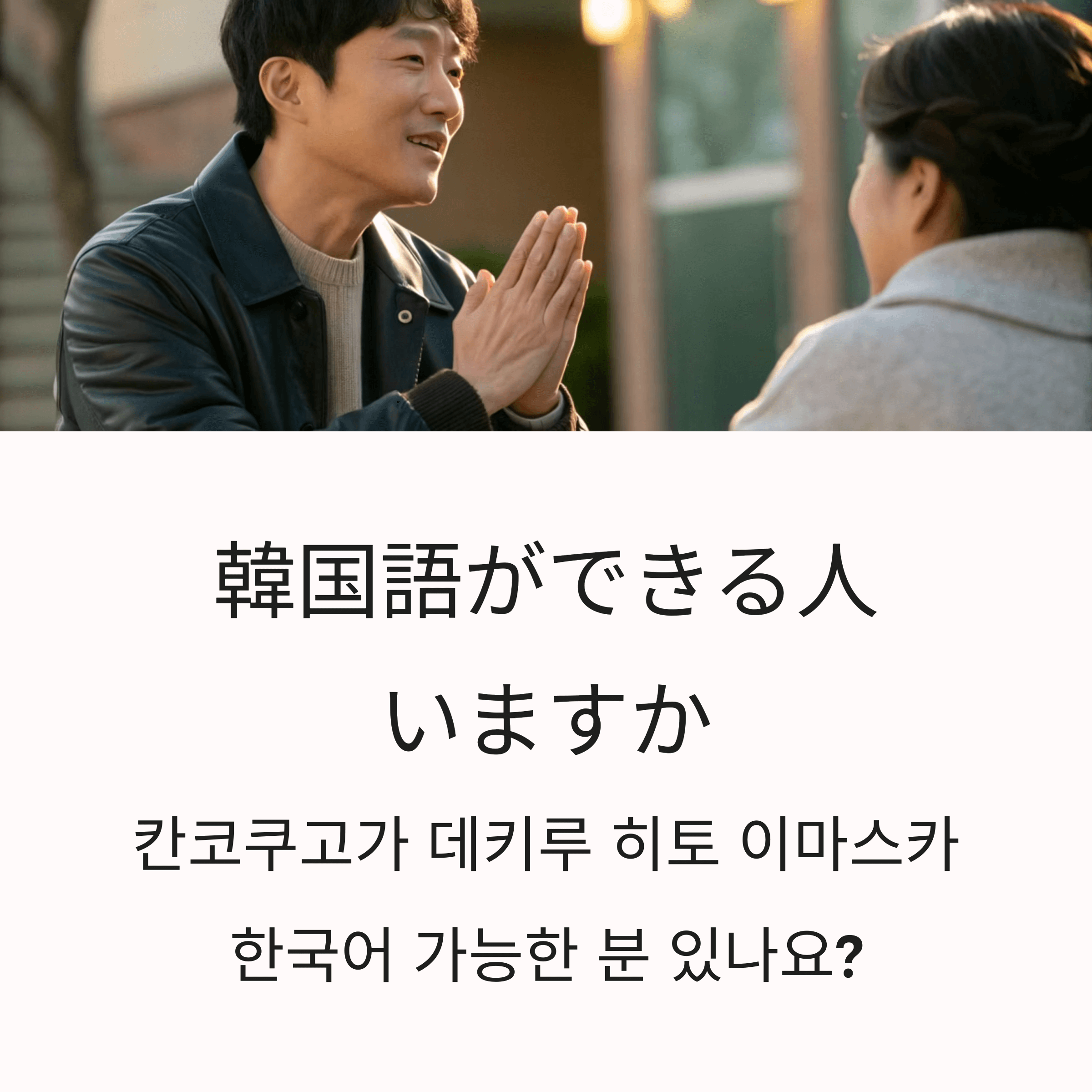👉 편한 사람, 친구에게, 비격식 상황에서는 “韓国語できる人?” (칸코쿠고 데키루 히토?) = 한국어 하는 사람 있어? 처럼 간단히 말할 수 있습니다.