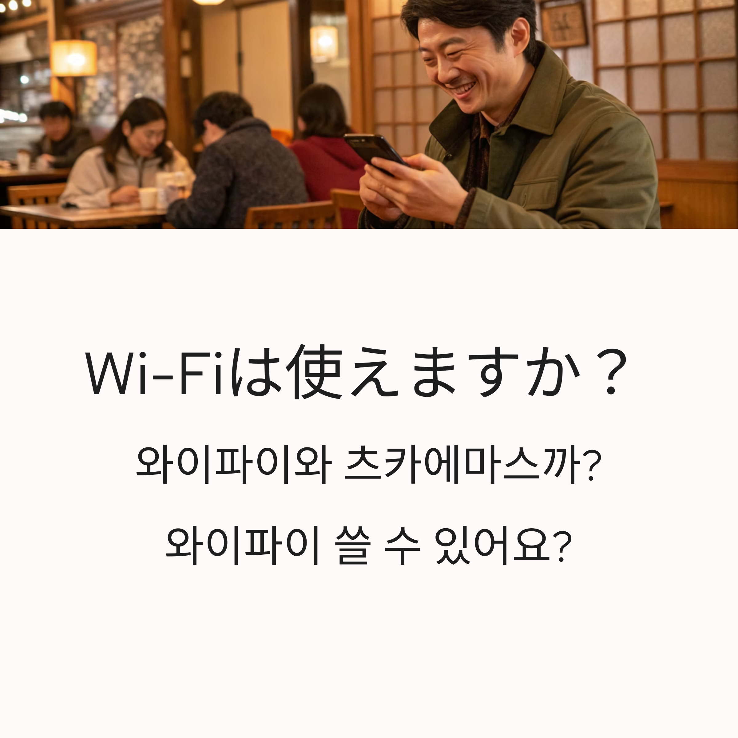 Wi-Fi(와이파이)는 일본에서도 영어 그대로 사용되고, 使えますか?(츠카에마스까?)는 ‘쓸 수 있나요?’라는 정중한 질문 표현이에요. 합치면 Wi-Fiは使えますか?는 “와이파이 쓸 수 있어요?”라는 뜻이 돼요. 호텔, 카페, 역 등에서 인터넷 가능 여부를 묻고 싶을 때 아주 유용해요. 발음은 와이파이와 츠카에마스까로 부드럽고 자연스럽게 물어보면 OK! 입니다^^
